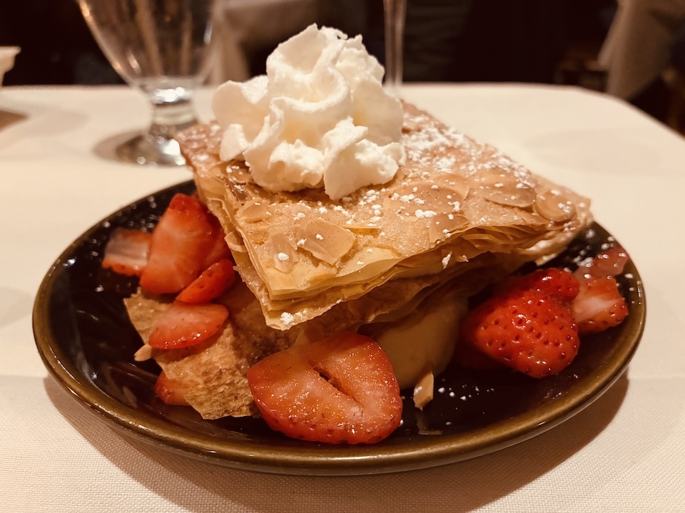 For dinner, we went to our favorite restaurant, which is the same place we visited last year. I think we might just make this an annual tradition. Mussels, as our starters, were incredibly fresh with no fishy taste at all; the white sauce was light and fragrant with a hint of lemon. The waitress even offered us extra bread so we could soak up every drop of the sauce. Our main courses were both delicious, but I am too tired tonight to go into detail. Samās favorite was their strawberry Napoleon for dessert. The pastry had almonds in it and was perfectly crisp.