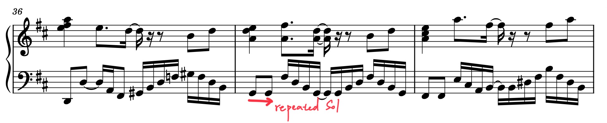 Since the chorus is fairly long, I wanted the accompaniment to stay engaging. For example, the first beat originally moves upward in octaves, yet after four measures I switch it to repeated notes instead. Another change is that the second beat originally used sixteenth notes, while later I changed it to dotted eighth notes. I like how these subtle variations keep the music alive.