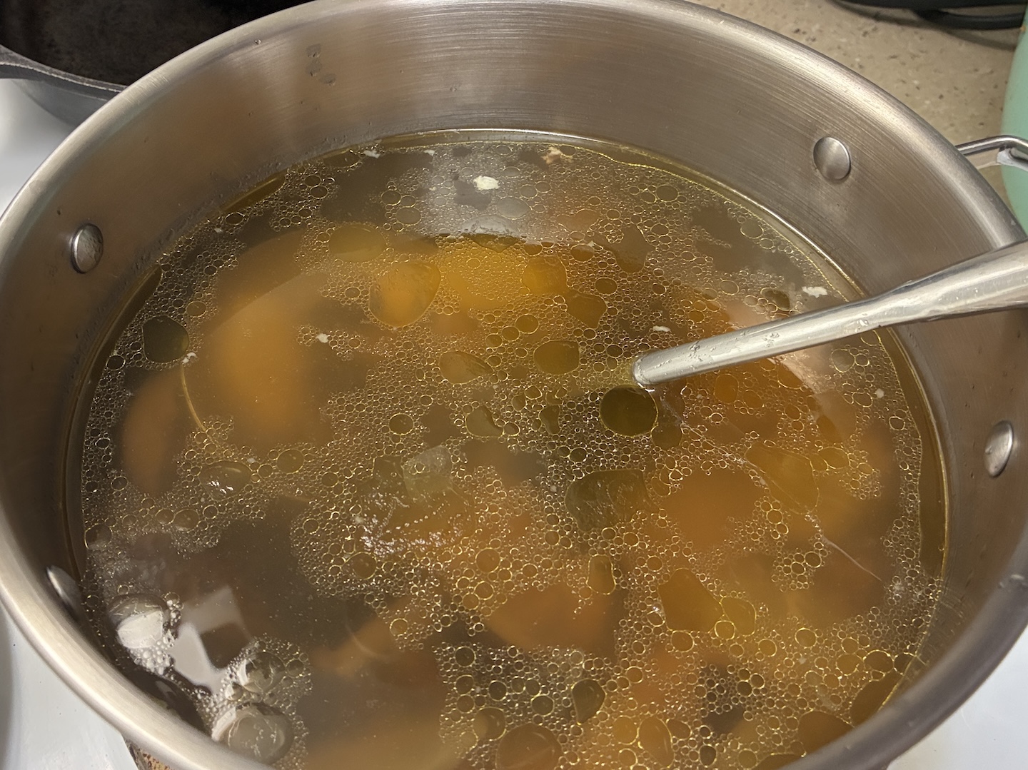 We put two cups of water in the outer pot, let it pop, added two more cups, and when it popped again, we had this perfect pot of chicken soup.