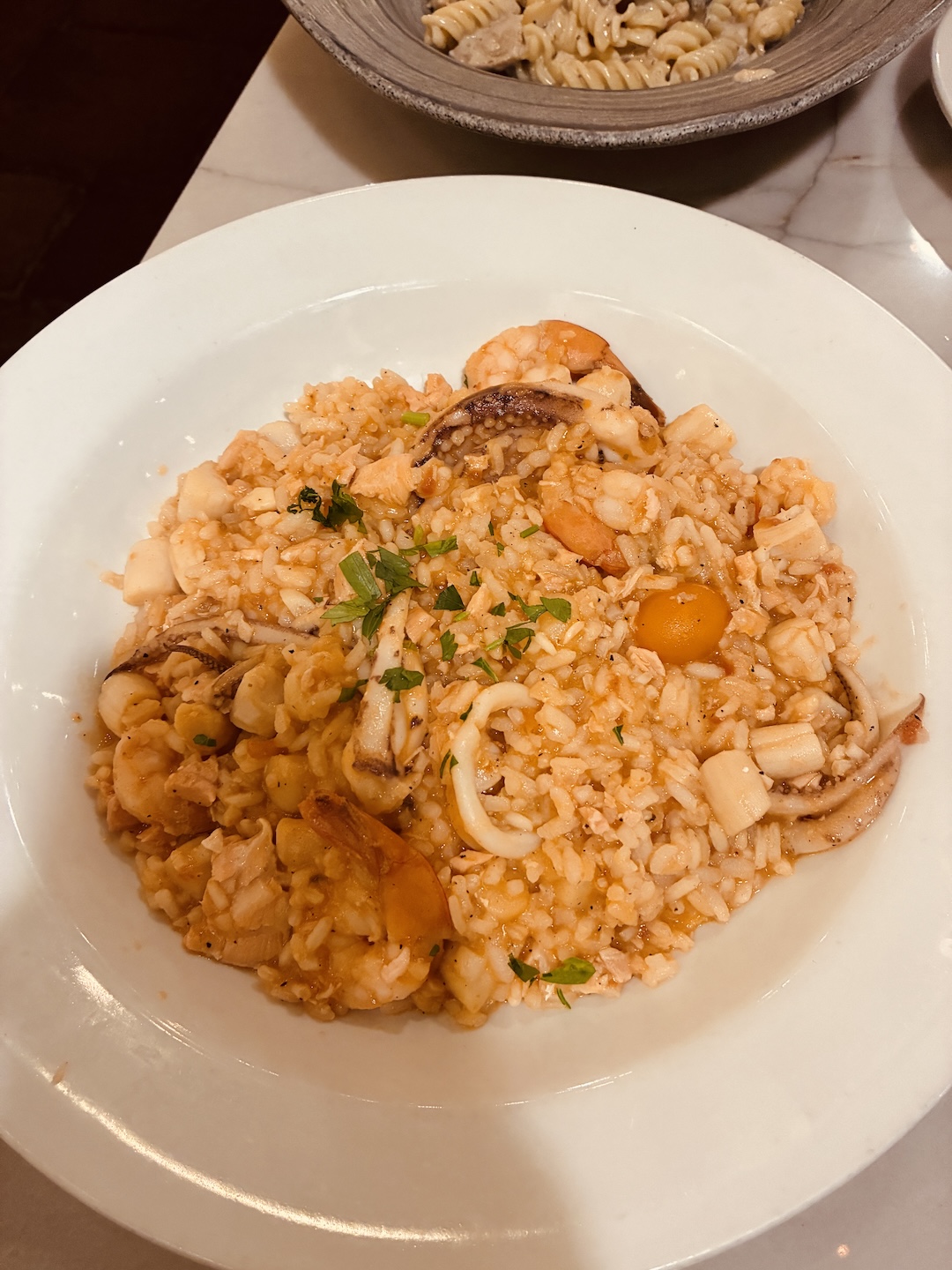 麵包大概是我五天的早餐份,1/2 份的 Cioppino 海鮮超多,燉飯則是堆得像一座小山。