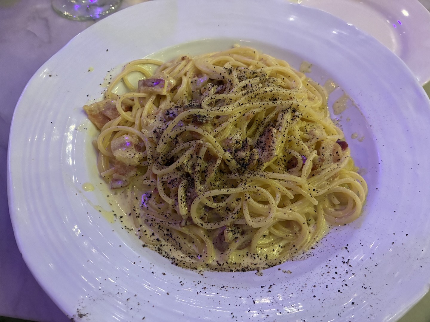 其中我覺得很酷的是起司輪義大利麵(Cheese Wheel Pasta),又以 Vincenzo 這家很酷炫(下面有影片),主廚做完義大利麵後(圖一),由服務生端來,並且推一個巨大的帕馬森起司進行桌邊服務:先拿噴槍將起司烤一烤,再把起司刮一刮,接著將義大利麵倒進去拌一拌,最後盛盤出餐。義大利麵裹了香濃的起司,怎能不好吃?我們也有和朋友吃另一間的 Cheese Wheel Pasta,不過他沒有用噴槍烤過起司,只有義大利麵安靜滑進去起司裡,拌個兩三下就出來了,跟這個不能比啊。