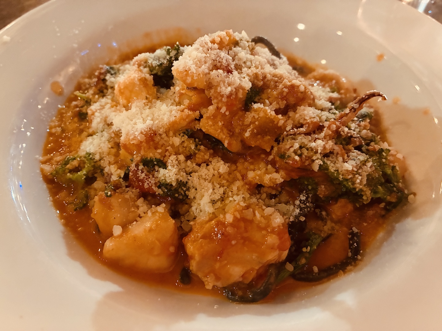 Cioppino (/tʃoʊˈpiːnoʊ/,聽起來像「秋皮~no」)算是來聖地牙哥必點的菜了吧!由於臨近海邊,小義大利區餐廳使用的海鮮有地利之便,新鮮便宜。不過,這裡也不是每間都有,我們找了一下,最後找到了Buon Appetito。那天我們兩個人其實都不太餓,就只點了一份 Cioppino 加上附餐的燉飯。老闆先上了一份餐廳招待的麵包,又上了附餐燉飯,接著幫我們的海鮮湯分成兩碗給我們(超貼心!我們沒有請他弄他就幫我們分了)。