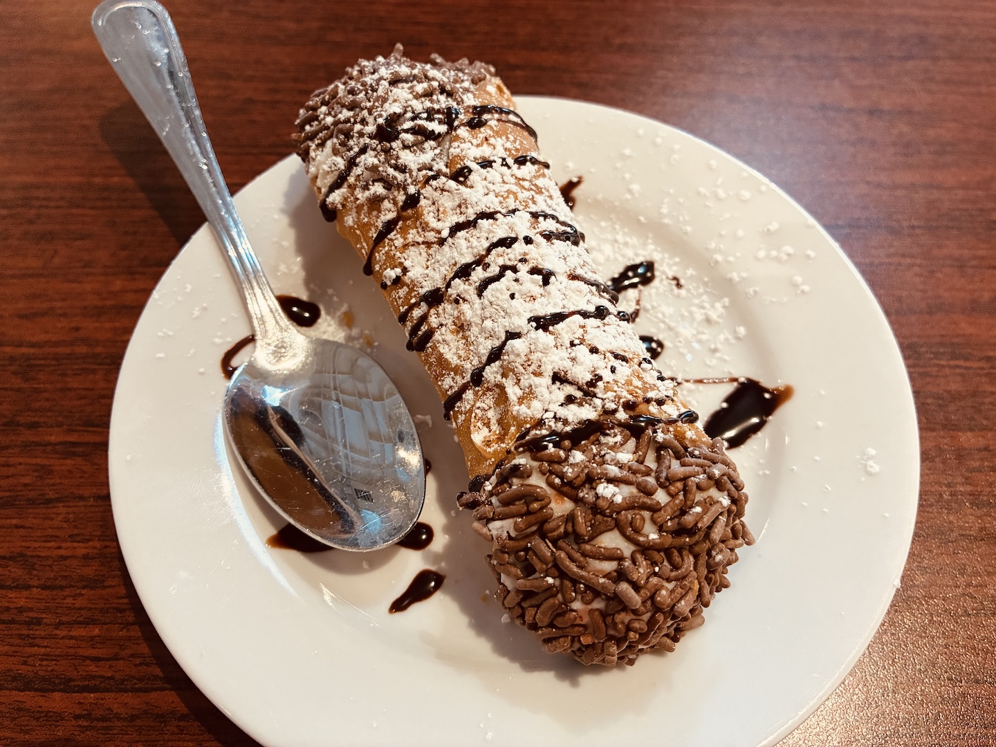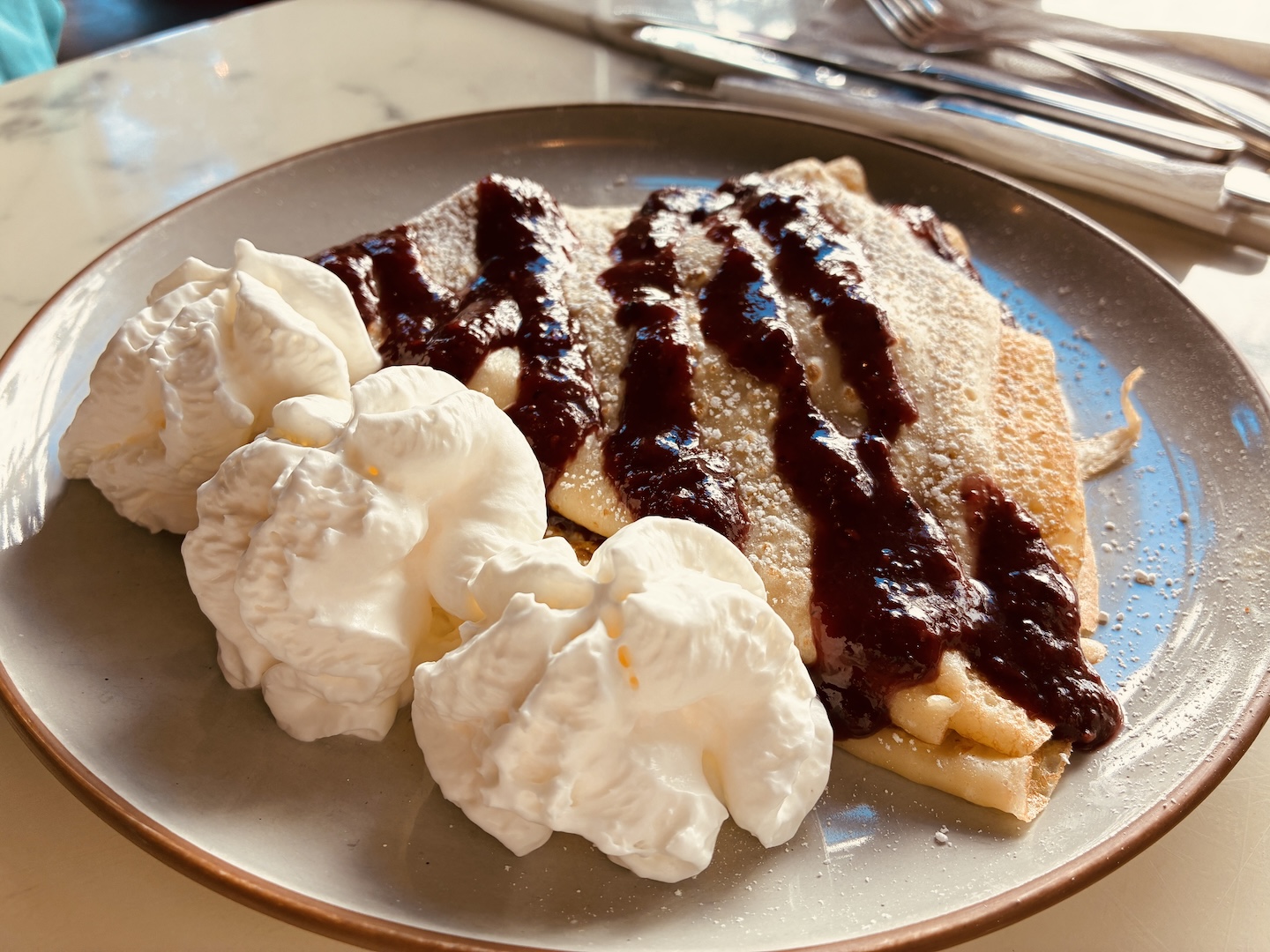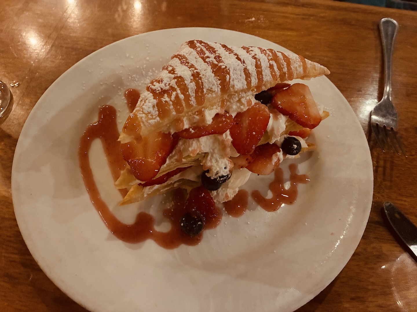 吃完正餐當然不能放過點心。照片上看起來沒那麼大,不過實際上這些甜點都是要兩個人或三個人才吃得完。說一說生平第一次吃到的 Crêpe 和 Cannoli 好了。台版的可麗餅是脆的,法式的餅皮是軟的,Le Parfait Paris 這間店賣多種口味的 Crêpe,我們點的 Crêpe 裡頭包了貨真價實的草莓,上頭又淋莓果醬,好吃!至於 Solunto 所賣的 Cannoli,店裏有賣大的和小的,我們買了一根大的分食,它的餅皮是硬脆的,而且味道吃起來有點像台灣的菜脯餅,有點出戲哈哈哈。不過柔軟的內餡配上酥脆的餅皮,整體來說還不錯吃。