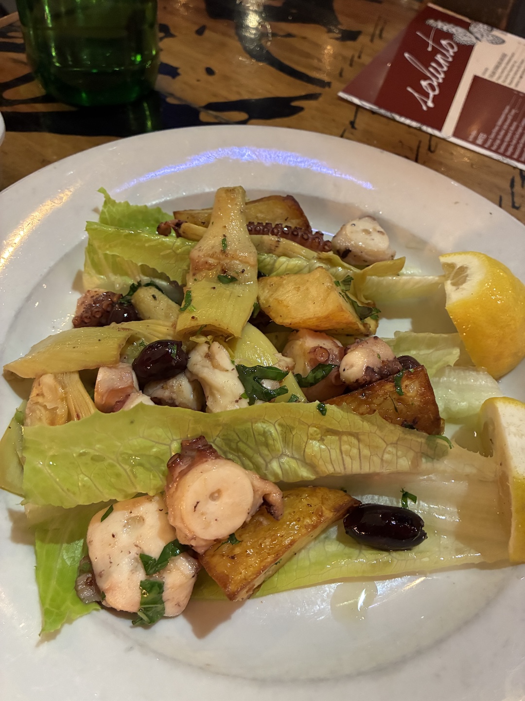 章魚沙拉裡頭包含了章魚、生菜、烤馬鈴薯、橄欖,以及朝鮮薊,擠上檸檬汁之後味道變得平衡清爽。我原本想像這些章魚應該是冷的,結果其實是熱的,而且口感極嫩,很好咀嚼,與章魚燒裡頭的章魚差很多。