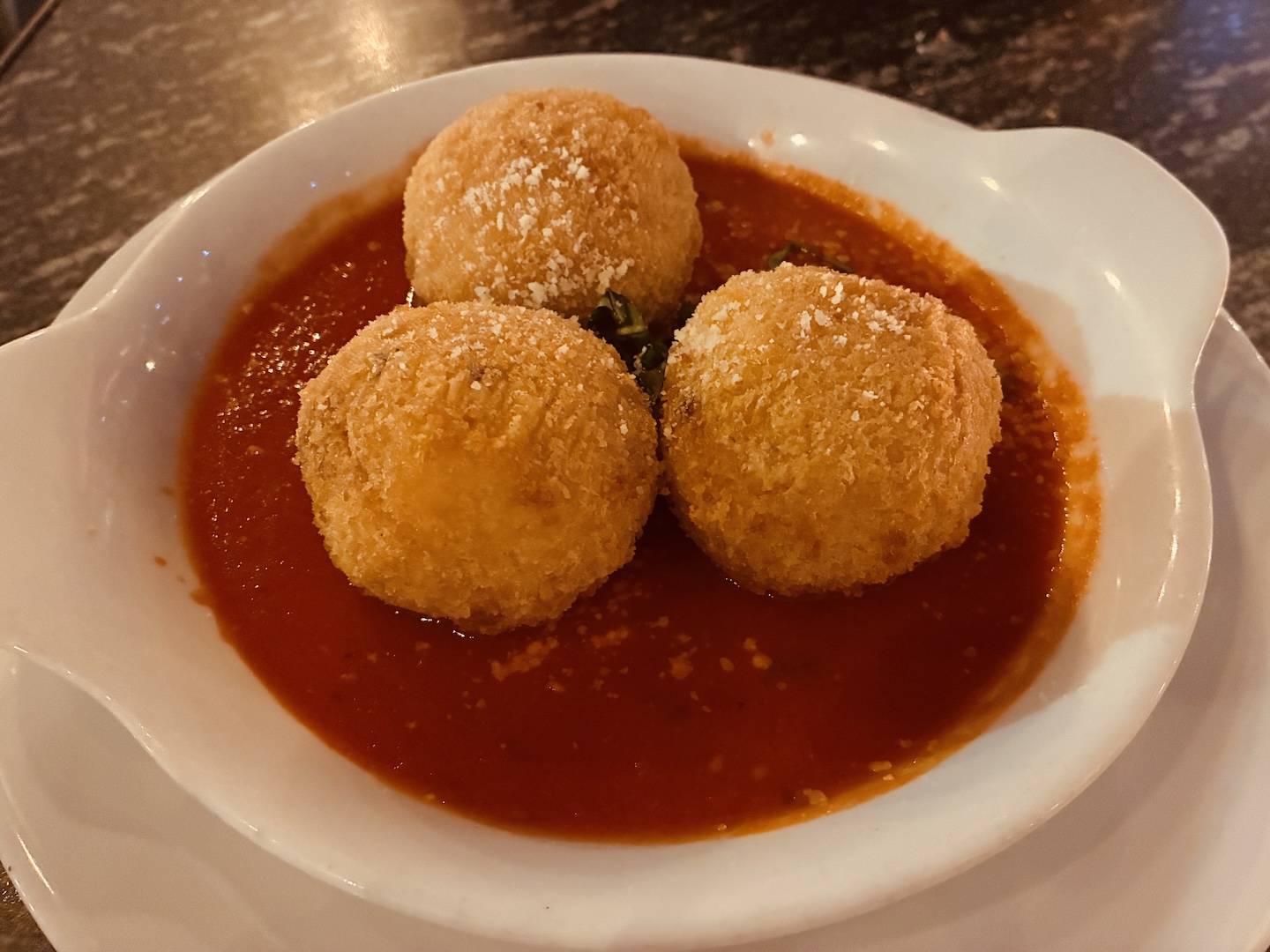 炸飯糰和章魚沙拉是我們分別在 Buon Appetito 以及 Solunto 兩間餐廳點的前菜。炸飯糰大概是我拳頭的 2/3 大小,是炸燉飯球裡包著肉醬、起司以及青豆的一道菜。咬下去外殼酥脆有炸飯糰特有的黏性,裡頭的醬味道濃郁,還會拉絲。我原本很排斥吃青豆(營養午餐三色豆的慘淡記憶猶新),不過這家的青豆完全沒有可怕的生豆味,而且軟硬適中,非常難得的好吃。事實證明,我不是挑食,而是不喜歡吃難吃的食物哈哈。